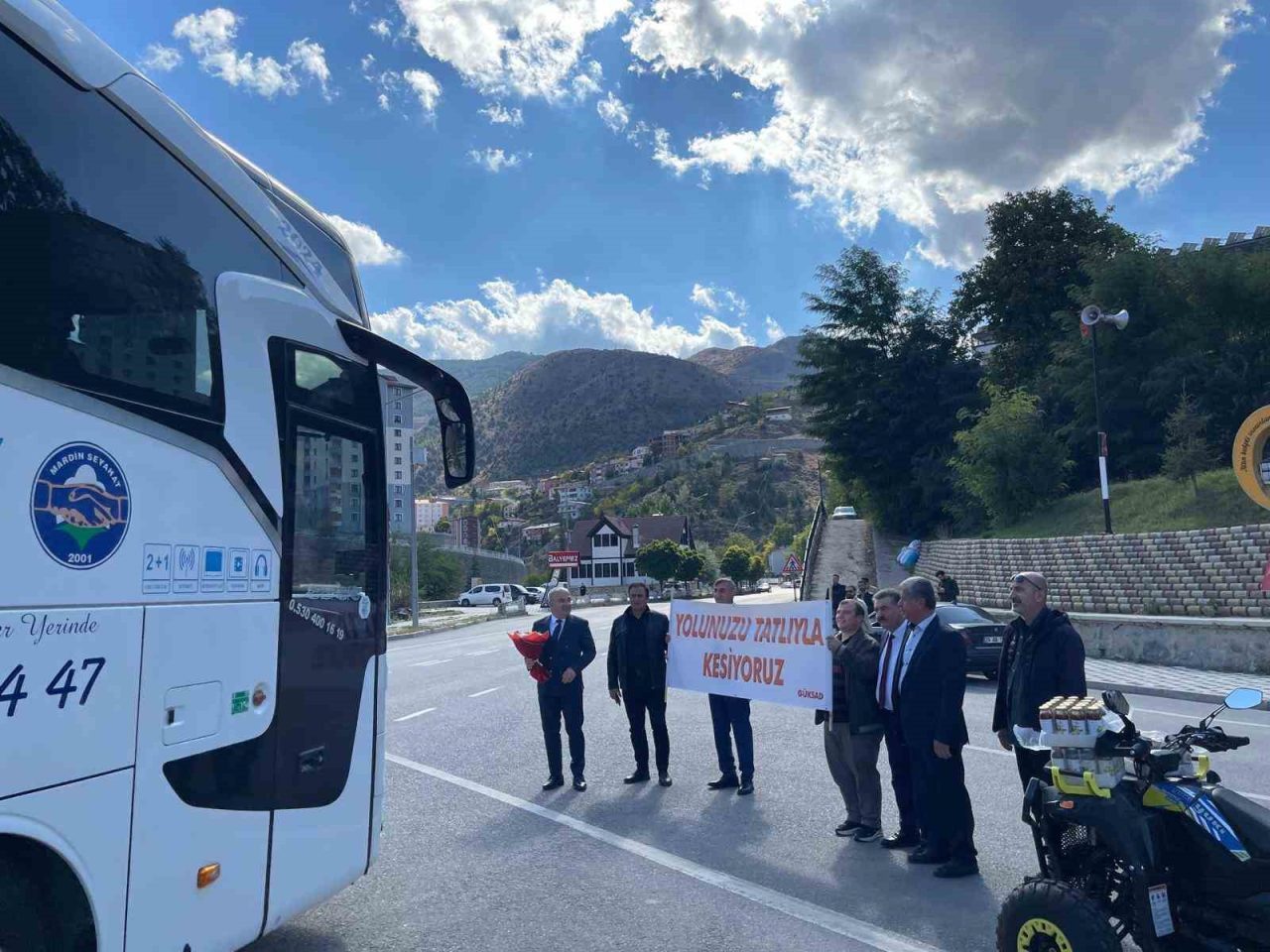 Gümüşhane Kültür ve Sanat Derneği (GÜKSAD) üyeleri, “Terörsüz Türkiye” sürecine destek amacıyla Mardin’e giden bir yolcu otobüsünü durdurarak, yolculara pestil, köme ve kuşburnu ikramında bulundu.
