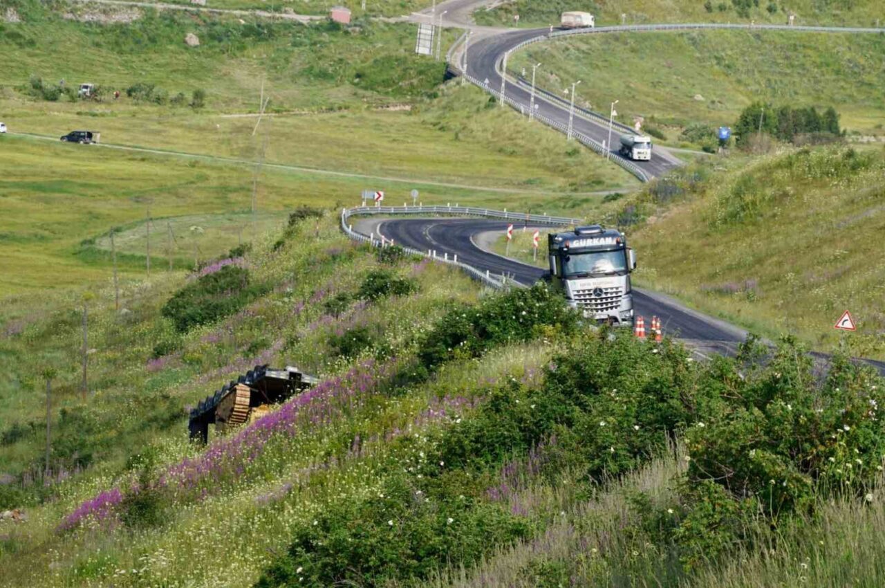 ARDAHAN İN POSOF İLÇESİNDE SEYİR HALİNDEKİ TIRDAN AYRILAN DOZER YÜKLÜ DORSE DEREYE UÇTU.