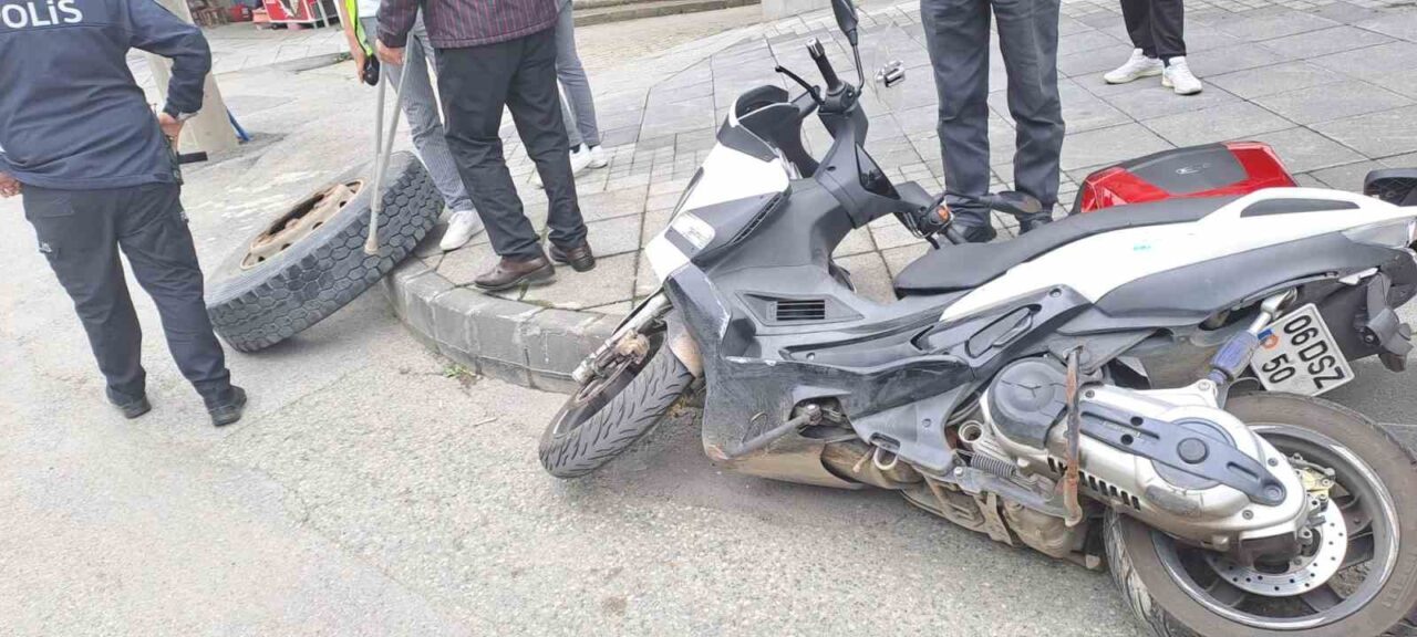 Trabzon’da seyir halinde giden bir tırdan aniden çıkan lastik yol kenarında bulunan motosiklete çarptı. Yaşanan olay güvenlik kameralarına saniye saniye yansıdı.