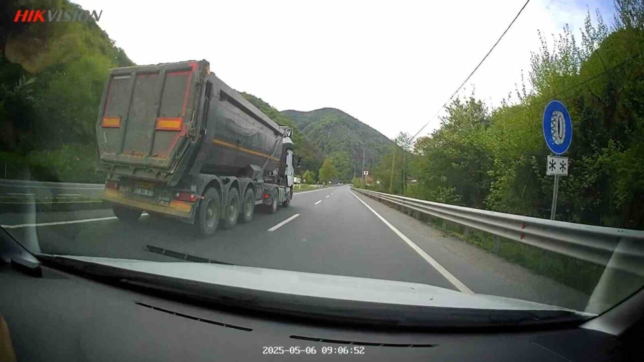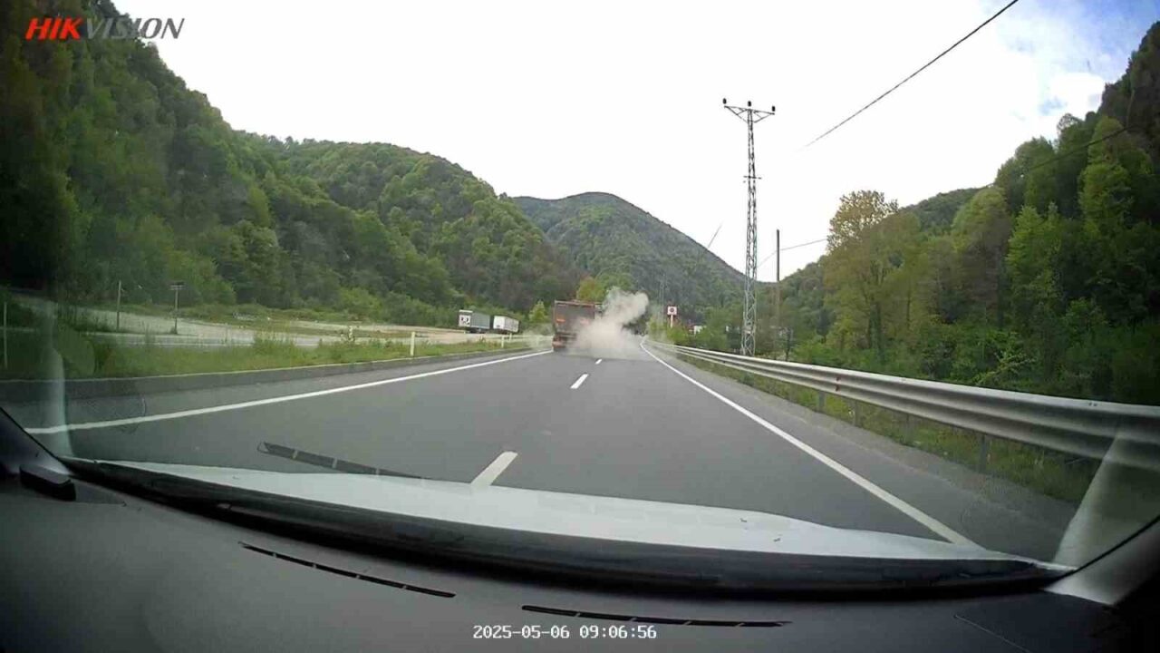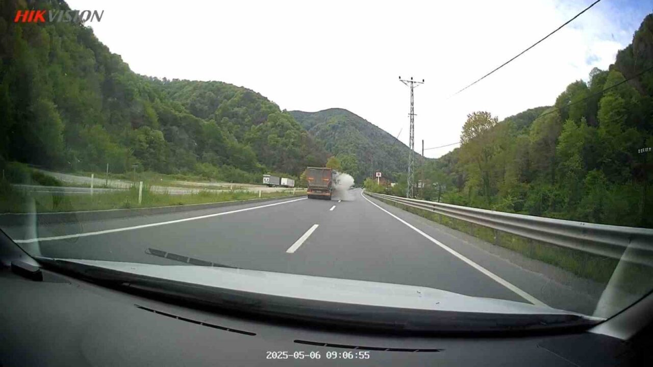 Zonguldak’ın Kozlu ilçesine bağlı Ilıksu mevkisinde, İstanbul istikametine seyir halinde olan bir tırın lastiği aniden patladı. Patlama anı, aynı güzergahtan geçen başka bir aracın araç kamerasına saniye saniye yansıdı.