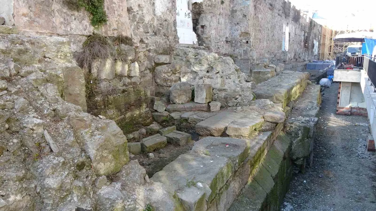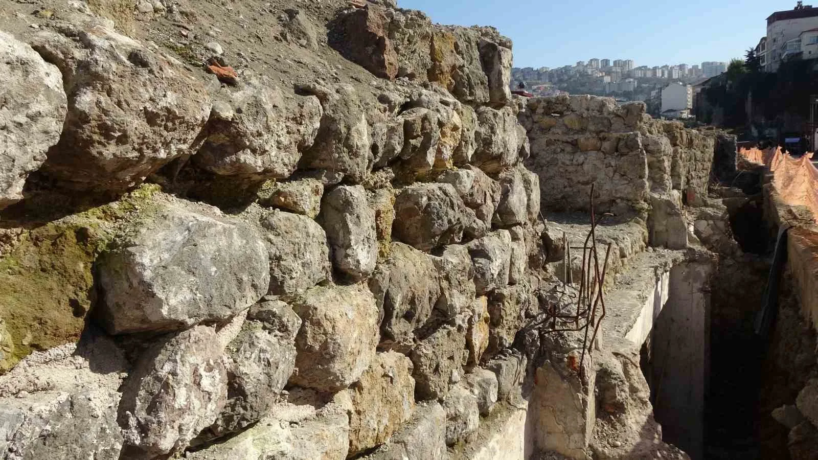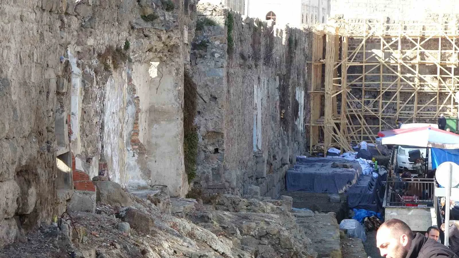 Trabzon’un Pazarkapı mahallesi Kadınlar Hali yanındaki tarihi sur duvarlarının restorasyon çalışmaları sürüyor.