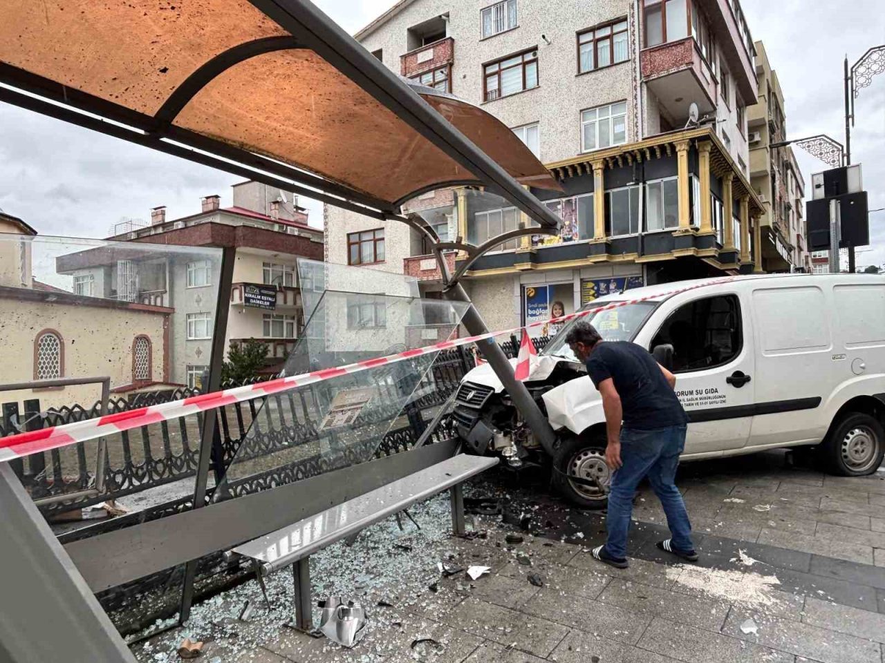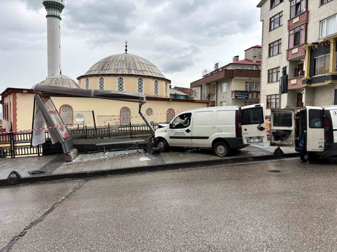 TRABZON’UN ORTAHİSAR İLÇESİNDE EL FRENİNİ ÇEKİLMEYEN ARAÇ, OTOBÜS DURAĞINA DALDI.