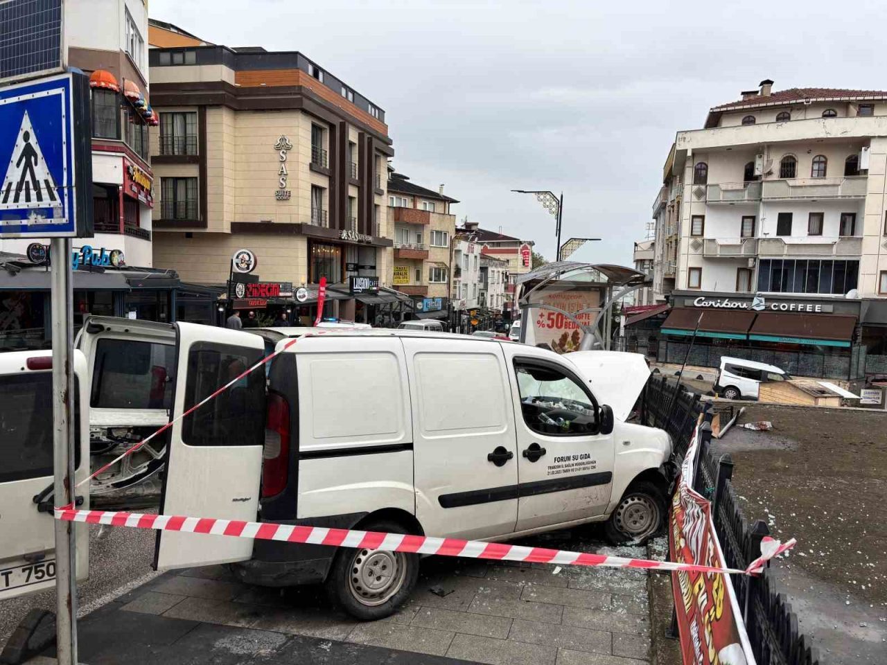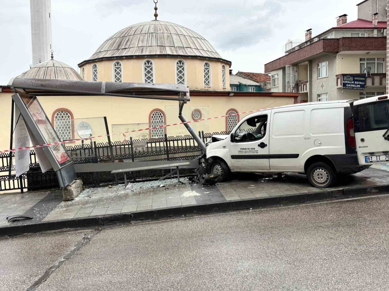Kaza, ilçeye bağlı Kalkınma mahallesinde meydana geldi. Edinilen bilgiye göre, sürücüsü belirlenemeyen 61 TT 760 plakalı Fiat marka hafif ticari araç, iddiaya göre sürücünün el frenini çekmeyi unutması üzerine hareket ederek yokuş aşağı kaymaya başladı. Sürücünün damacana su boşaltmak için indiği araç, kontrolden çıkarak otobüs durağına çarparak durabildi. Kazada şans eseri ölen ya da yaralanan olmazken, otobüs durağında maddi hasar meydana geldi. Çevredeki vatandaşların büyük panik yaşadığı anlar ise güvenlik kamerasına saniye saniye yansıdı.