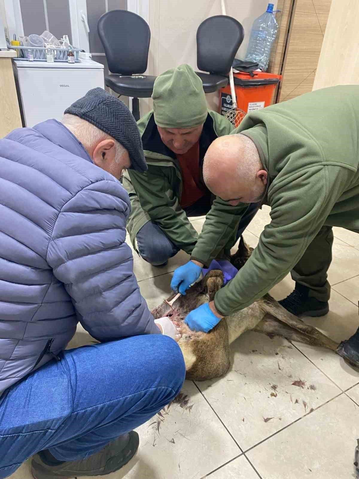 Ameliyatı gerçekleştiren Aydın, “Yaralı karacanın ilk muayenesini ve tetkiklerini yaptık. Vücudunda yaralanmalar vardı. Yaptığımız operasyonla yaraları diktik, pansuman işlemlerini yaptık ve antibiyotiklerini verdik. Hayati tehlikesi yok, sağlık durumu da iyiye gidiyor” ifadelerini kullandı.