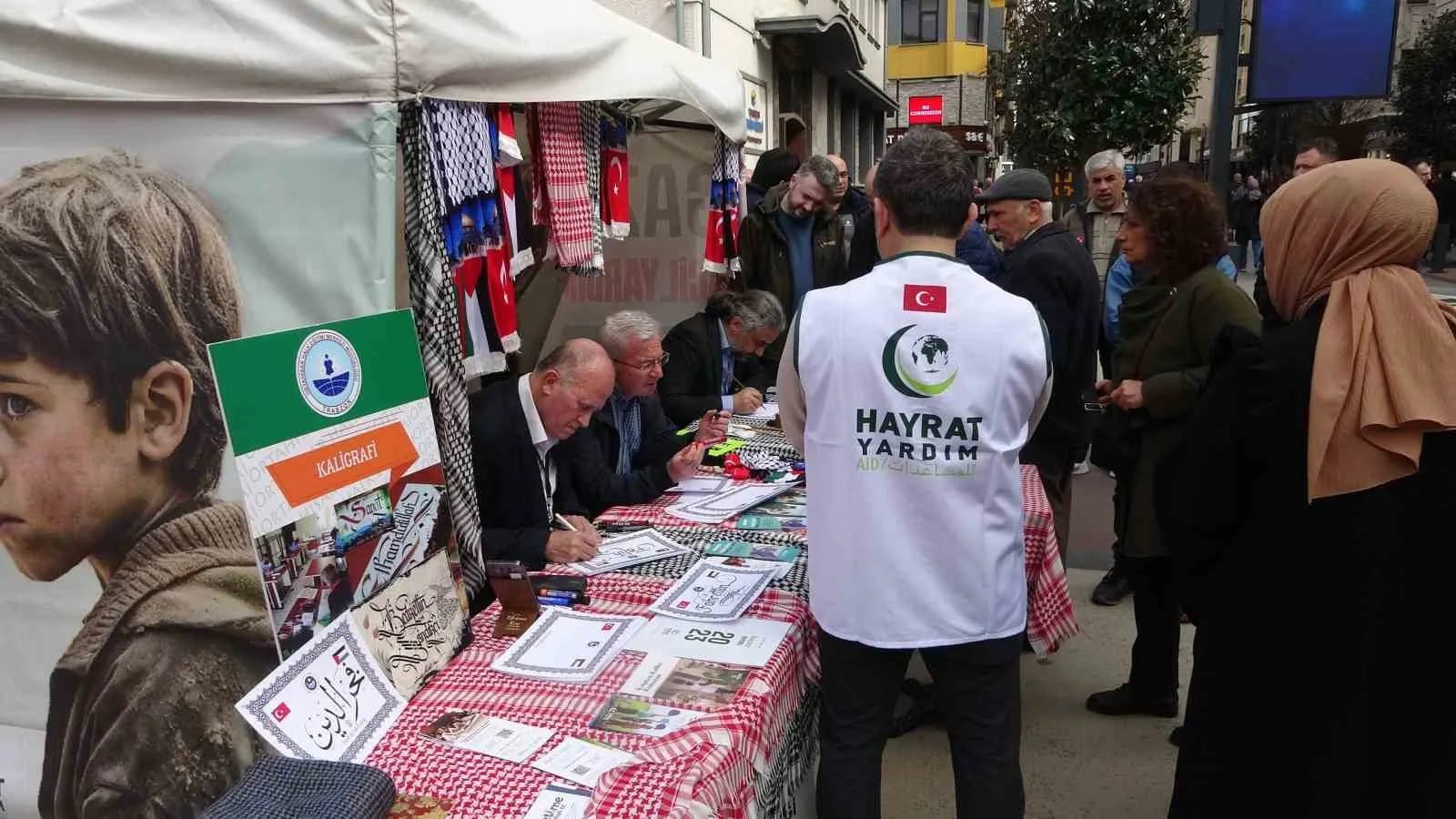 Trabzon’un Ortahisar ilçesindeki Kahramanmaraş Caddesi’nde Filistin’e destek için yardım çadırı kuran Hayrat Vakfı tarafından bir etkinlik düzenledi. Trabzon Üniversitesi İlahiyat Fakültesi İslam Tarihi ve Sanatları Bölümü Türk İslam Sanatları Tarihi Anabilim Dalında Öğretim Görevlisi Fatih Sultan Demir ve Halk Eğitim Merkezi’nden gelen hat sanatçıları tarafından Filistin’e yardım toplandı. Filistin’e yardım etmek isteyen vatandaşların isimleri hat sanatı ile yazılarak hediye edilirken, Öğretim Görevlisi Fatih Sultan Demir, hat sanatına vatandaşların ilgi gösterdiğini söyledi.