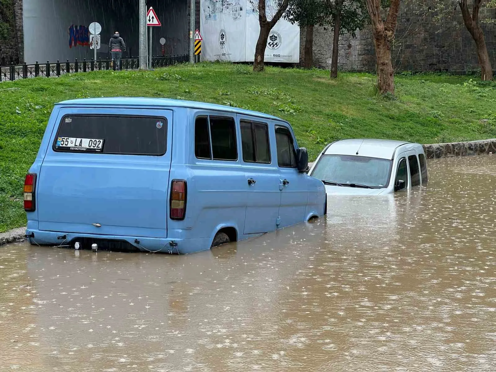 Trabzon’da etkisini gösteren şiddetli yağışlar sonucu göle dönen yolda bulunan park halindeki araçlar su altında kaldı.