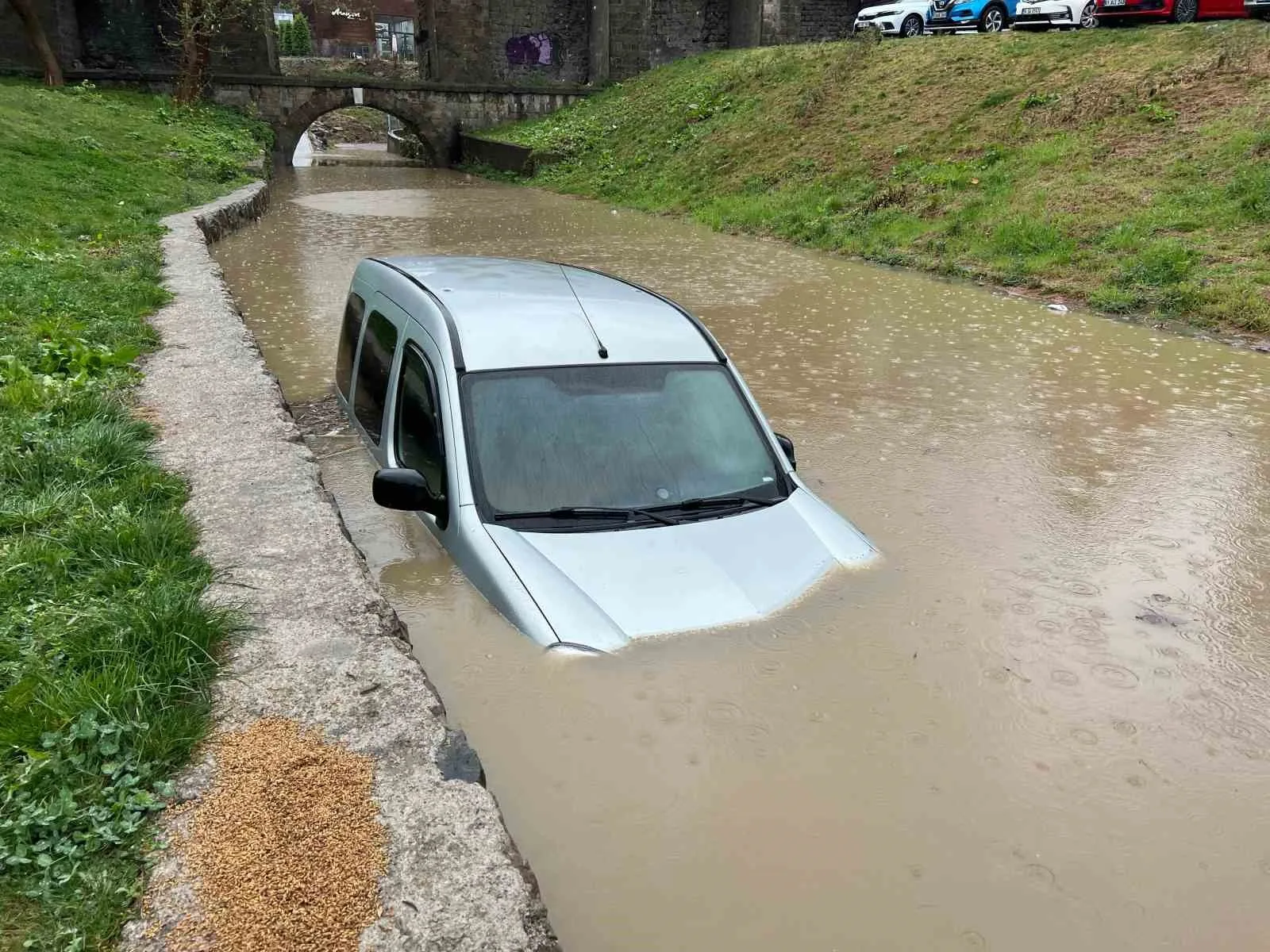 TRABZON’UN ORTAHİSAR İLÇESİNDE ETKİSİNİ GÖSTERMEYE BAŞLAYAN ŞİDDETLİ YAĞIŞLAR SONUCU GÖLE DÖNEN YOLDA BULUNAN PARK HALİNDEKİ ARAÇLAR SU ALTINDA KALDI.