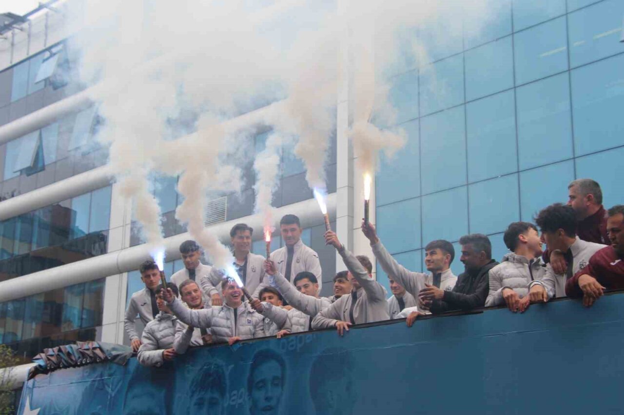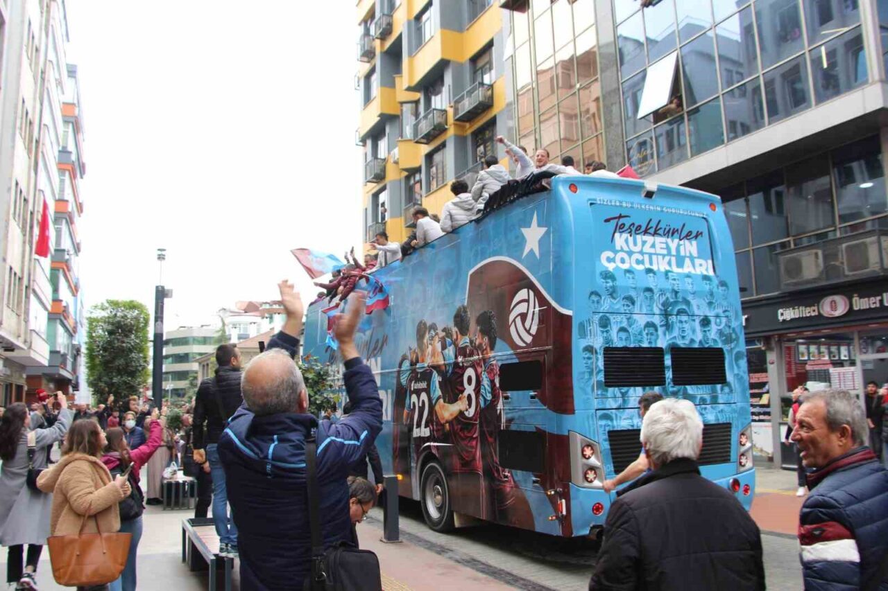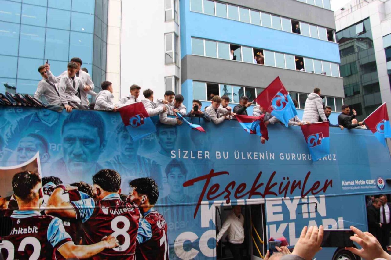 UEFA Gençlik Ligi final maçında İspanyol ekibi Barcelona’ya 4-1 mağlup olarak turnuvayı ikinci tamamlayan Trabzonspor U19 takımı, üstü açık otobüs ile Trabzon sokaklarında tur attı, taraftarlarla buluştu.