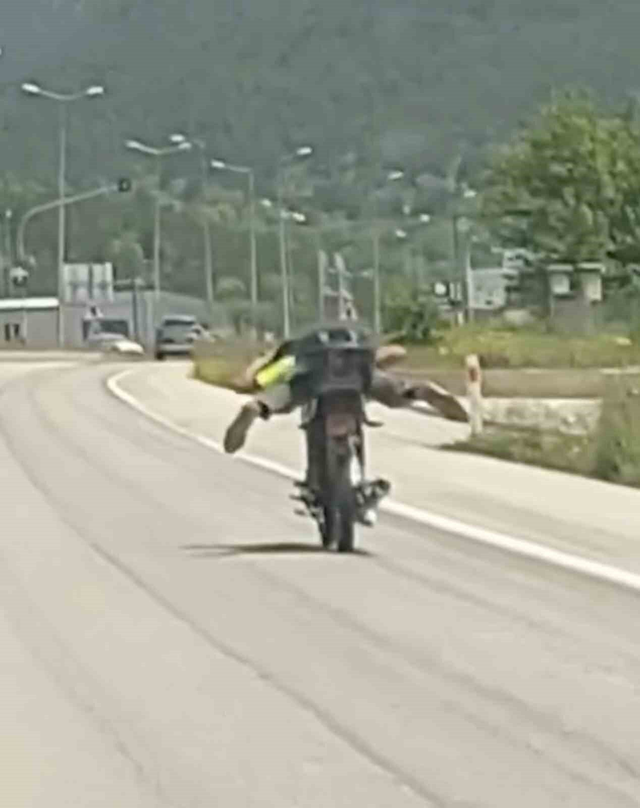 Edinilen bilgiye göre, Kastamonu-İnebolu karayolu Kastamonu Organize Sanayi Bölgesi mevkiinde seyir halinde olan bir motosiklet sürücüsü, motosikletin üzerine uzanarak ilerlemeye çalıştı. Araçların yanında tehlikeli hareketler yapan motosiklet sürücüsüne diğer araçlardaki vatandaşlar korna çalarak tepki gösterdi. O anlar vatandaşlar tarafından saniye saniye görüntülendi.