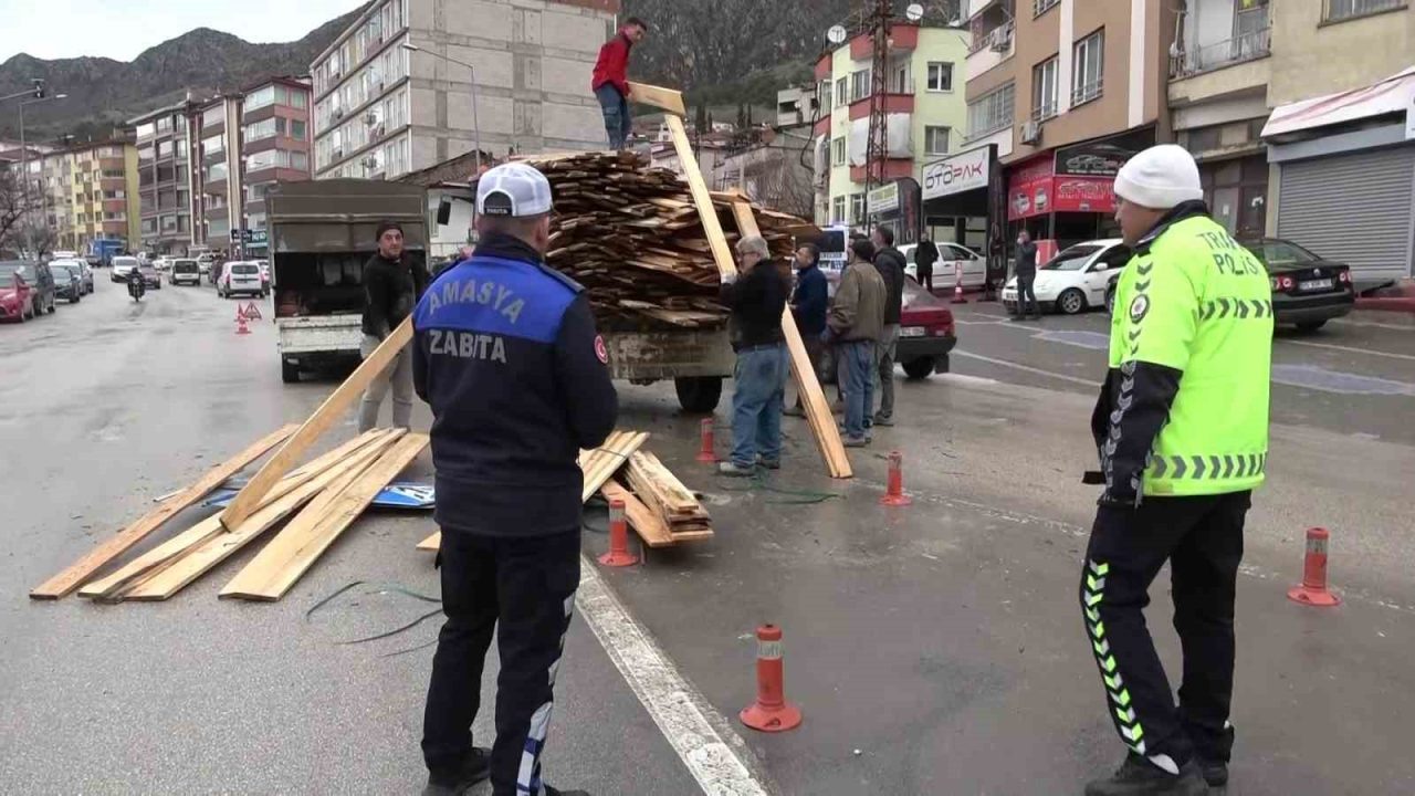 Amasya’da tünel çıkışı kavşaktan dönen traktörün römorku yan yatarak devrilirken, römorktaki keresteler yola dağıldı. Arkadaşlarının yardımına yetiştiği sürücü, “Verdiğimiz rahatsızlıktan dolayı özür dileriz” dedi.