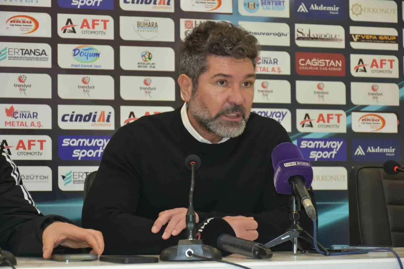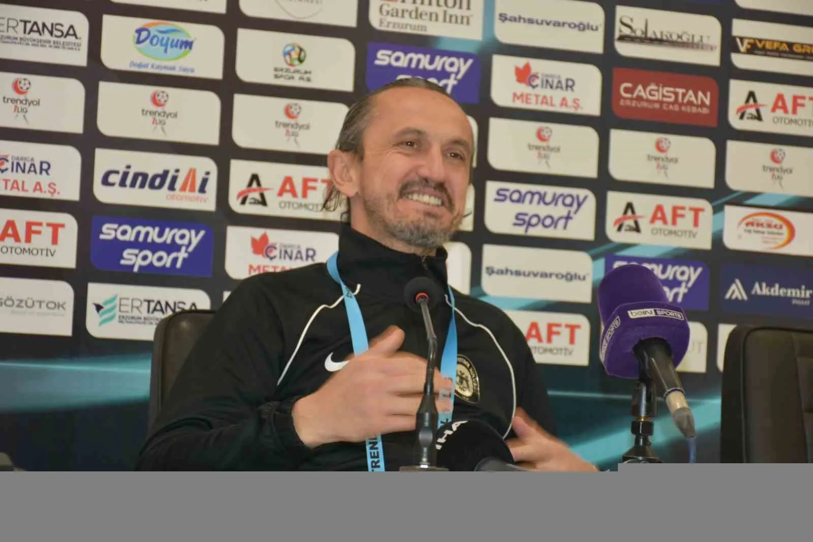 Trendyol 1. Lig’in 33. haftasında Erzurumspor FK, sahasında karşılaştığı Çorum FK ile 1-1 berabere kaldı. Maçın ardından düzenlenen basın toplantısında Ezrurumspor Teknik Direktörü Hakan Kutlu ile Çorum FK Teknik Direktörü Tuncay Şanlı açıklamalarda bulundu. Hakan Kutlu, kazanmak için sahaya çıktıklarını ifade ederek, “Maça gelince, tabii ki kazanmak istediğimiz bir maçtı. Kazandığımız takdirde, lig ikincisiyle aramızdaki puan farkını koruyacak ve onların akşamki maçını bekleyecektik. Aslında ilk yarı, pozisyon anlamında çok zengin olmasa da gol girişimi açısından birçok pozisyon vardı. 90 dakika kontrol bizdeydi. Rakibimiz ikinci yarıda oyunun belli bölümlerinde oyuna ortak oldu. Birkaç geçiş yaptılar. Zannediyorum, tek attıkları şut da kalemize gol oldu” dedi.
