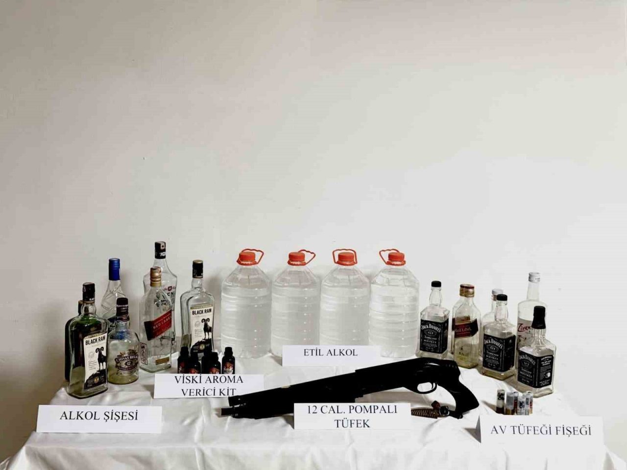 Operasyonlar kapsamında yapılan aramalarda; 1 adet elektrikli sigara sarma makinesi, 181 bin 940 adet sigara filtresi, 12 bin 877 gram kıyılmış sarmalık tütün, 907 adet makaron, 20 litre etil alkol, 5 adet alkol aroma kiti, 14 adet doluma hazır alkol şişesi, 1 adet ruhsatsız av tüfeği ele geçirildi.