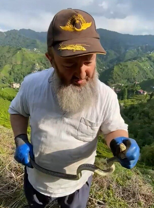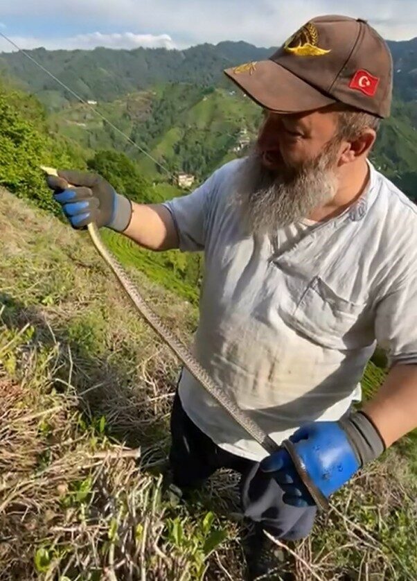 Rize’nin Çayeli ilçesine bağlı Büyükköy Beldesi’nde yaşayan Ali Dilmaç isimli çay müstahsili, önümüzdeki günlerde açılması beklenen çay sezonuna hazırlık için tarlasına girerek bakımlarını tamamlamak istedi. Tarlasında yabani otları temizleyen Dilmaç, otların arasında kıvrılan yılanı fark ederek zarar vermeden yakaladı. Halen hayatta olan yılanın nasıl bir şey olduğunu anlatan Dilmaç’ın yanında bulunan yakını ise o anları cep telefonu kamerası ile kaydetmeye başladı.