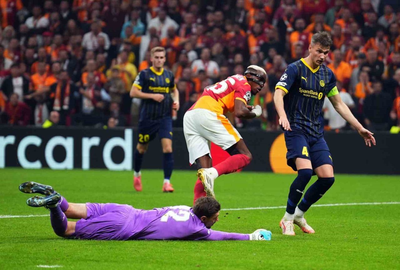 44. dakikada Bodo/Glimt’in direkten dönen topu sonrası kontratağa çıkan Galatasaray’da sağ kanattan topla ilerleyen Leroy Sane’nin ceza sahası sağ içine doğru gönderdiği pasta Osimhen’in çapraz pozisyonda dar açıdan yerden şutunda meşin yuvarlak kalenin sağından auta çıktı.