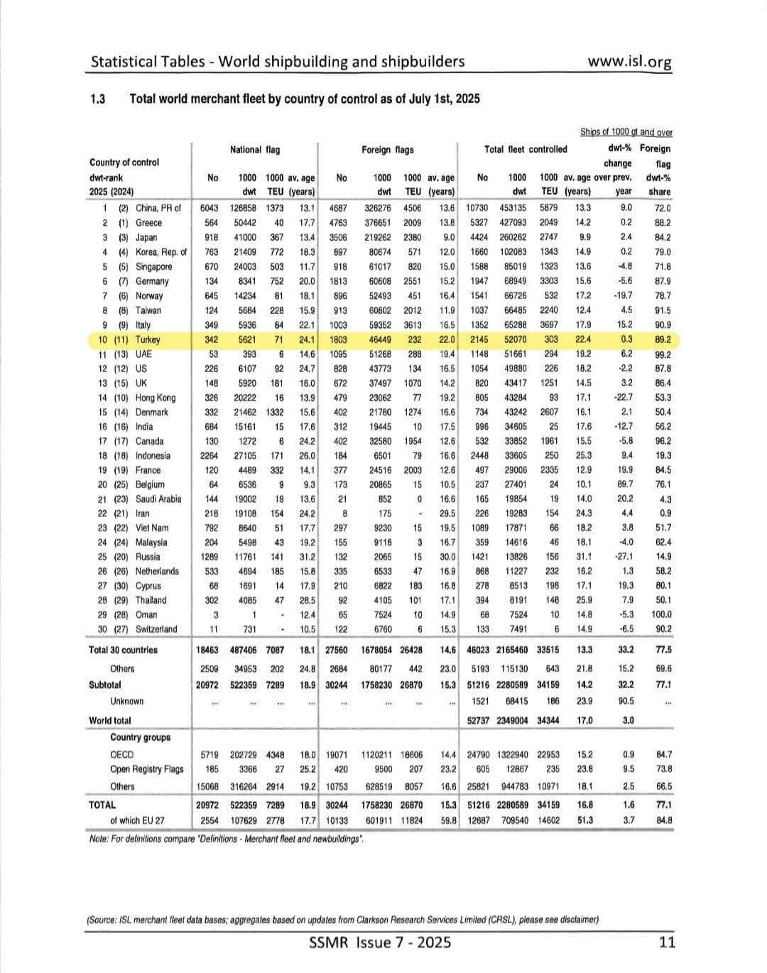 TÜRK DENİZ TİCARET FİLOSU DÜNYA SIRALAMASINDA İLK 10’A YÜKSELDİ