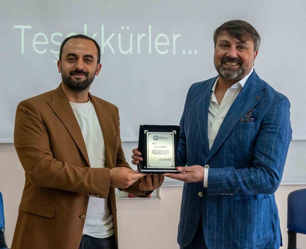 EĞİTİM PROGRAMININ SONUNDA ÖZEL İMPERİAL HASTANESİ GENEL MÜDÜRÜ CİHAN BAŞOĞLU’NA KTÜ SAĞLIK BİLİMLERİ FAKÜLTESİ SAĞLIK YÖNETİMİ BÖLÜMÜ ARŞ. GÖR. DR. AHMET YASİN YEŞİLDAĞ TARAFINDAN PLAKET VERİLDİ