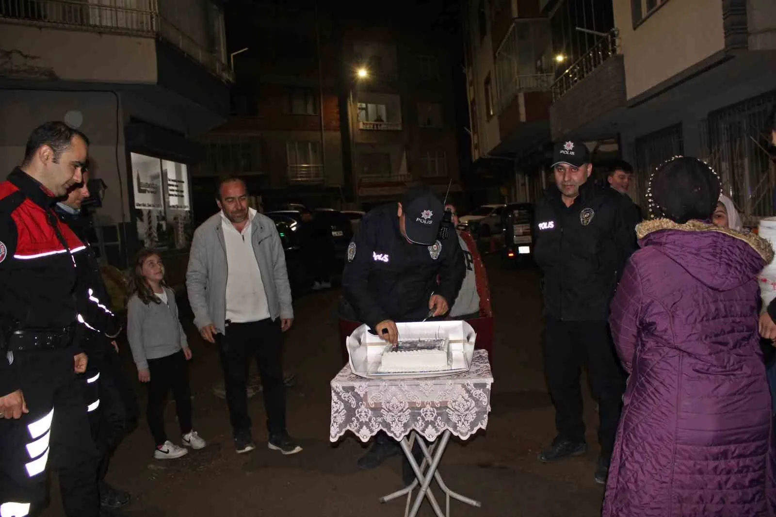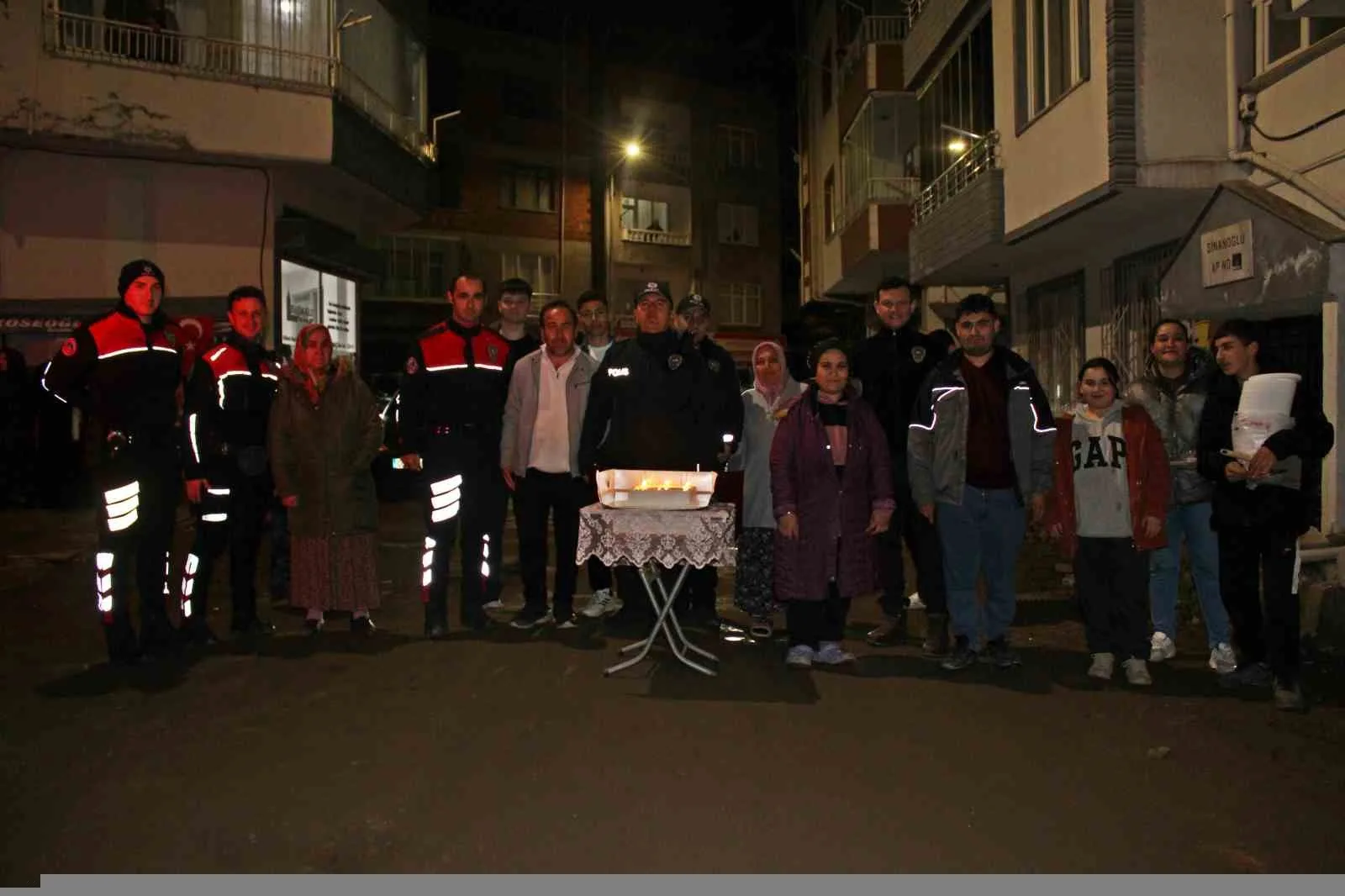 Ordu’nun Ünye ilçesinde bıçak ve silahlı kavga ihbarına giden polis ekiplerini mahalleli pasta sürpriziyle karşıladı.