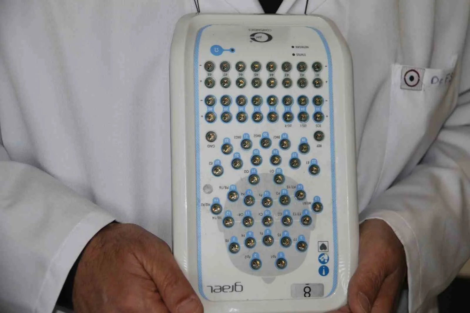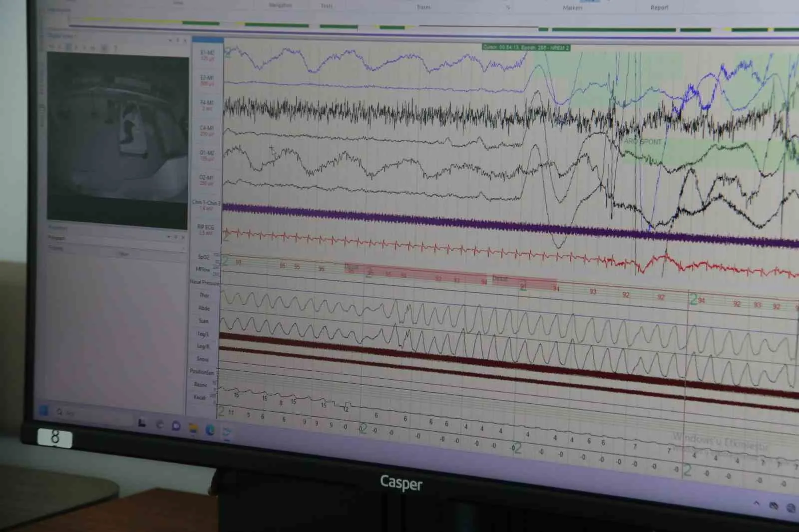 Yaklaşık 2 dakika boyunca hiç nefes alamayan hastaların olduğunu söyleyen Moğulkoç, “Hastalarımızın akşam saat 22.00 öncesinde kablolarını bağlıyoruz. Yaklaşık 16 ila 20 arasında kablo bağlıyoruz. Eg, göz, çene, burun, göğüs kafesi ve kalp elektrotu şeklinde kablolarını bağlıyoruz. Ortalama 6 ila 8 saat boyunca hastanın normal yatakta uyumasını takip ediyoruz. Hastada uyku derinliği ve uyku derinliği esnasında solunumunun nasıl seyrettiğini tespit ediyoruz. Bu hastaların özellikle gündüz uykusuzlukları ve dikkatsizlikler oluyor. Kalp ve diğer organların oksijenden mahrum kalması nedeniyle birçok rahatsızlıklar ortaya çıkabiliyor. Yaptığımız cihaz testleriyle gece rahat uyumasını ve tüm vücudun oksijenlenmesini sağlayarak gününü de rahat geçirmesini sağlamış oluyoruz. Yaklaşık 2 dakika solunumu duran hastalar oluyor yani 2 dakika boyunca hiç nefes almıyor ve bu durumda her şey etkileniyor. Hastalarımızın büyük çoğunluğu kilolu, obez hastalar ve boynu kısa olan hastalardır. Boyun kısa olması solunumu zorlaştırıyorken, obezite de vücuttaki oksijen ihtiyacını artırıyor. Hastalarımız cihaz kullanırken ya da titrasyon yaparken ciddi şekilde rahatlama hissettiklerini hatta bir çok hastamız bize gelerek burada basınçlı hava verdiğimiz için buradaki o testi yaptıktan sonra bir hafta boyunca çok rahat olduklarını ifade ediyorlar” diye konuştu.