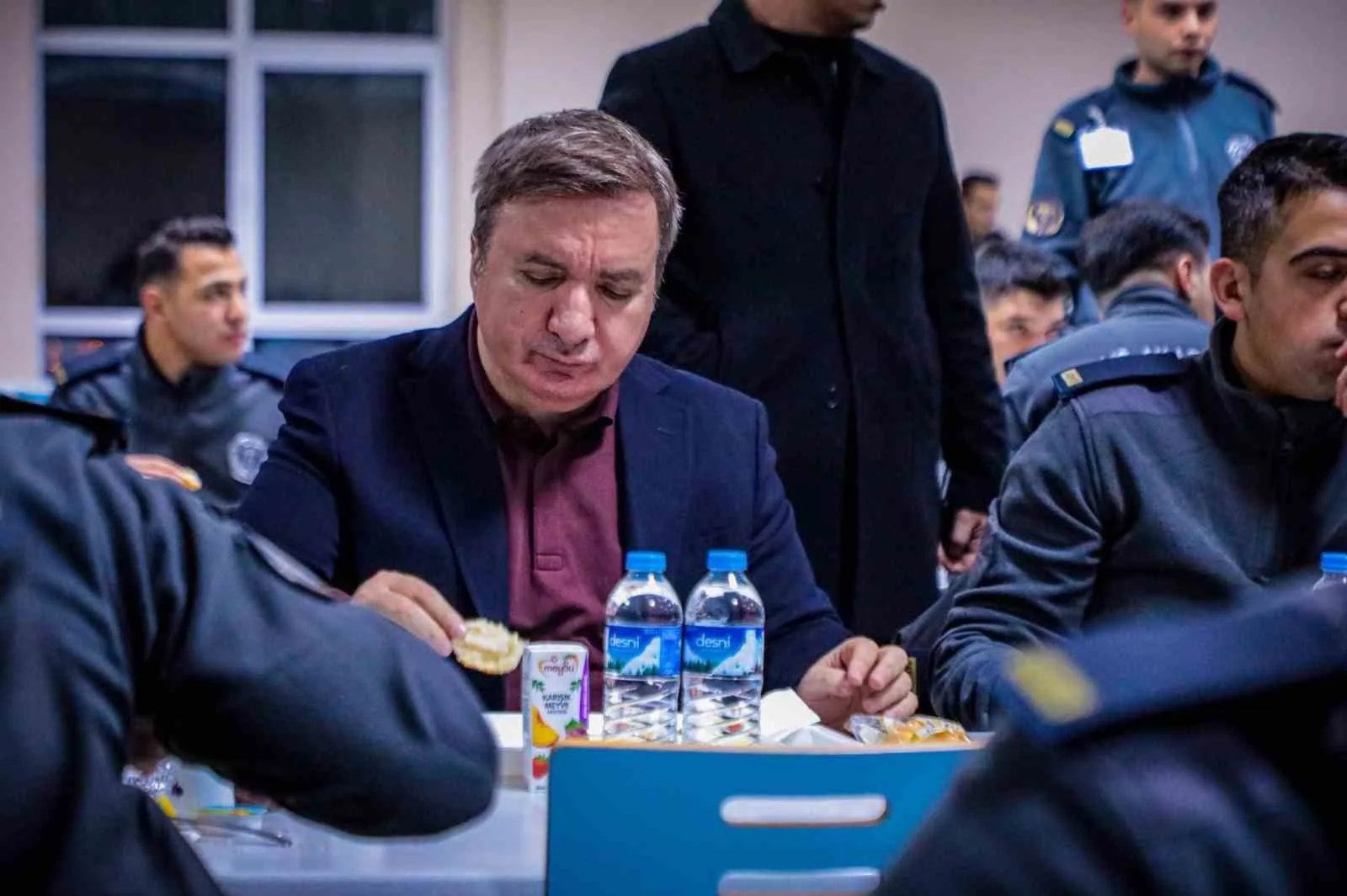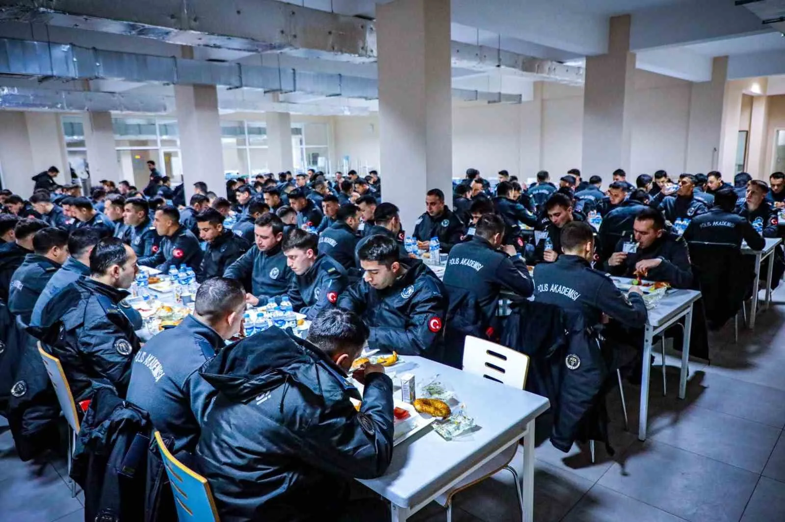 Sahur sofrasında polis adaylarıyla bir araya gelen Vali Aydoğdu, “Bugün aynı sofranın etrafında omuz omuza oturan yiğitlerimiz, yarın ülkemizin dört bir yanında aziz milletimizin huzuru ve güvenliği için çalışacak. Bu kutlu yolda görev alacak yiğitlerimizin yolları bahtları açık olsun. Ayaklarına taş değmesin inşallah” dedi.