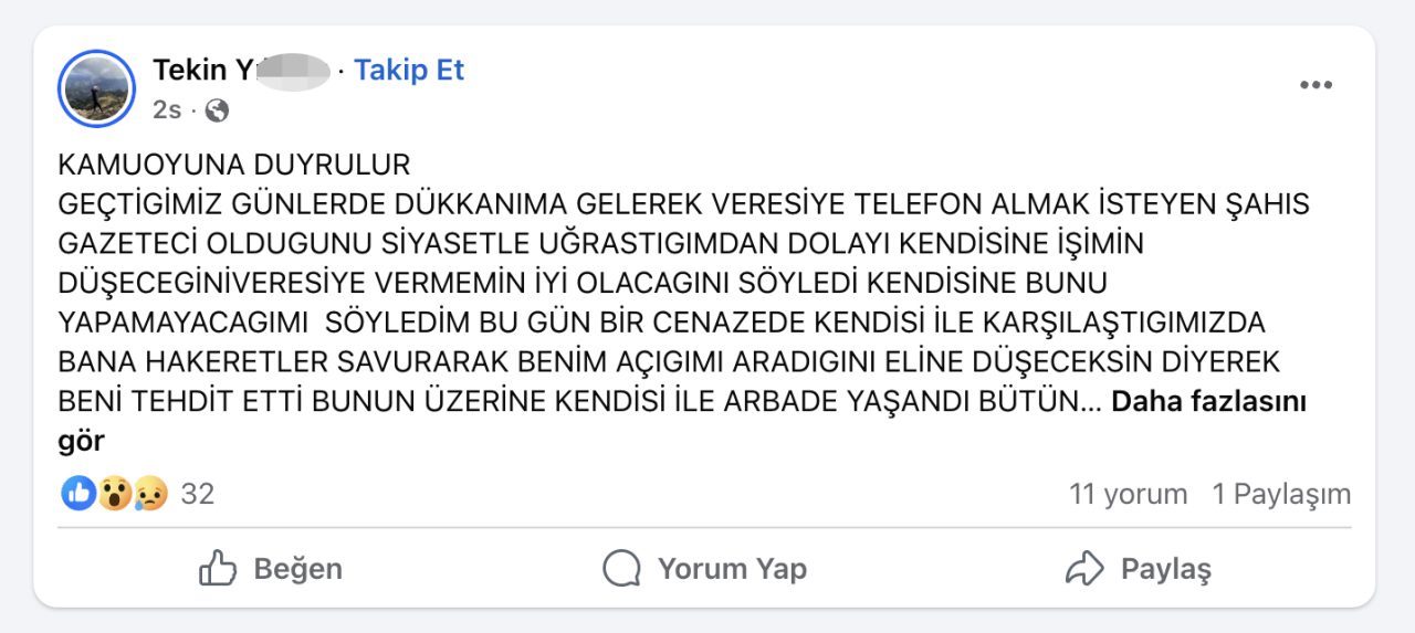 OLAY SONRASI SOSYAL MEDYA HESABINDAN AÇIKLAMA YAPAN TEKİN Y, “GEÇTİĞİMİZ GÜNLERDE DÜKKANIMA GELEREK VERESİYE TELEFON ALMAK İSTEYEN ŞAHIS, GAZETECİ OLDUĞUNU, SİYASETLE UĞRAŞTIĞIMDAN DOLAYI KENDİSİNE İŞİMİN DÜŞECEĞİNİ, VERESİYE VERMEMİN İYİ OLACAĞINI SÖYLEDİ. KENDİSİNE BUNU YAPAMAYACAĞIMI SÖYLEDİM. BUGÜN BİR CENAZEDE KENDİSİYLE KARŞILAŞTIĞIMIZDA BANA HAKARETLER SAVURARAK BENİM AÇIĞIMI ARADIĞINI, ‘ELİME DÜŞECEKSİN’ DİYEREK BENİ TEHDİT ETTİ. BUNUN ÜZERİNE KENDİSİYLE ARBEDE YAŞANDI. BÜTÜN OLAY BUNDAN İBARET, SİYASİ BİR YÖNÜ YOKTUR” İFADELERİNİ KULLANDI.
