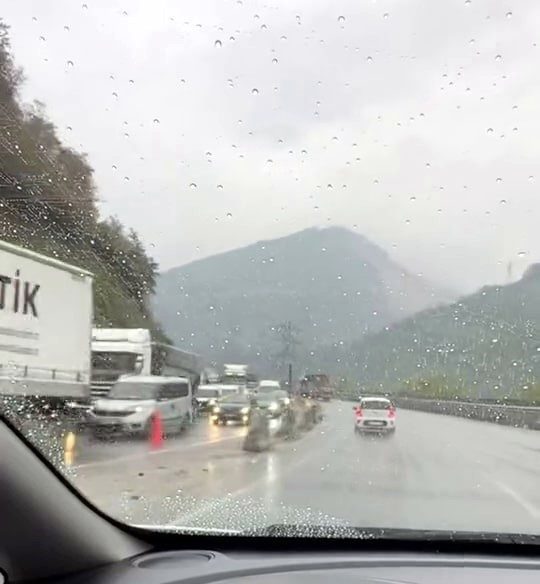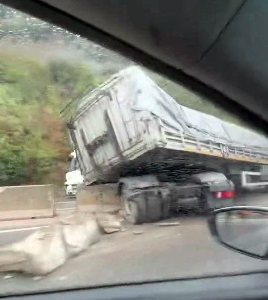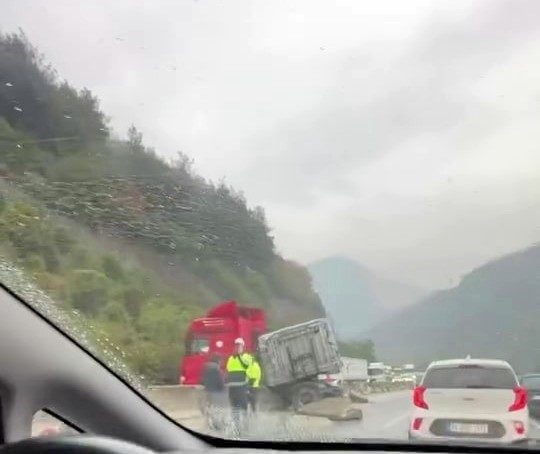 Sakarya’nın Geyve ilçesi D-650 kara yolunda yağışın etkisi ile sürücüsünün kontrolünden çıkan tır, orta refüje çarparak makasladı. Kaza sebebi ile bölgede uzun araç kuyrukları oluştu.
