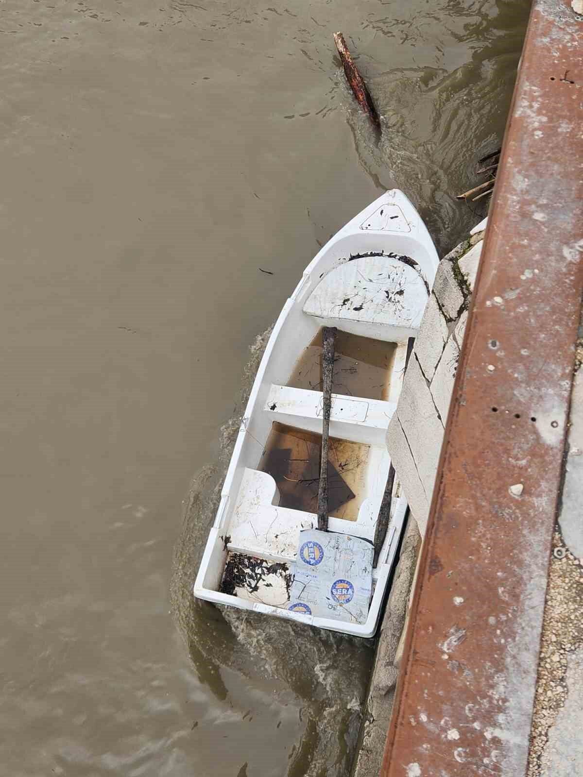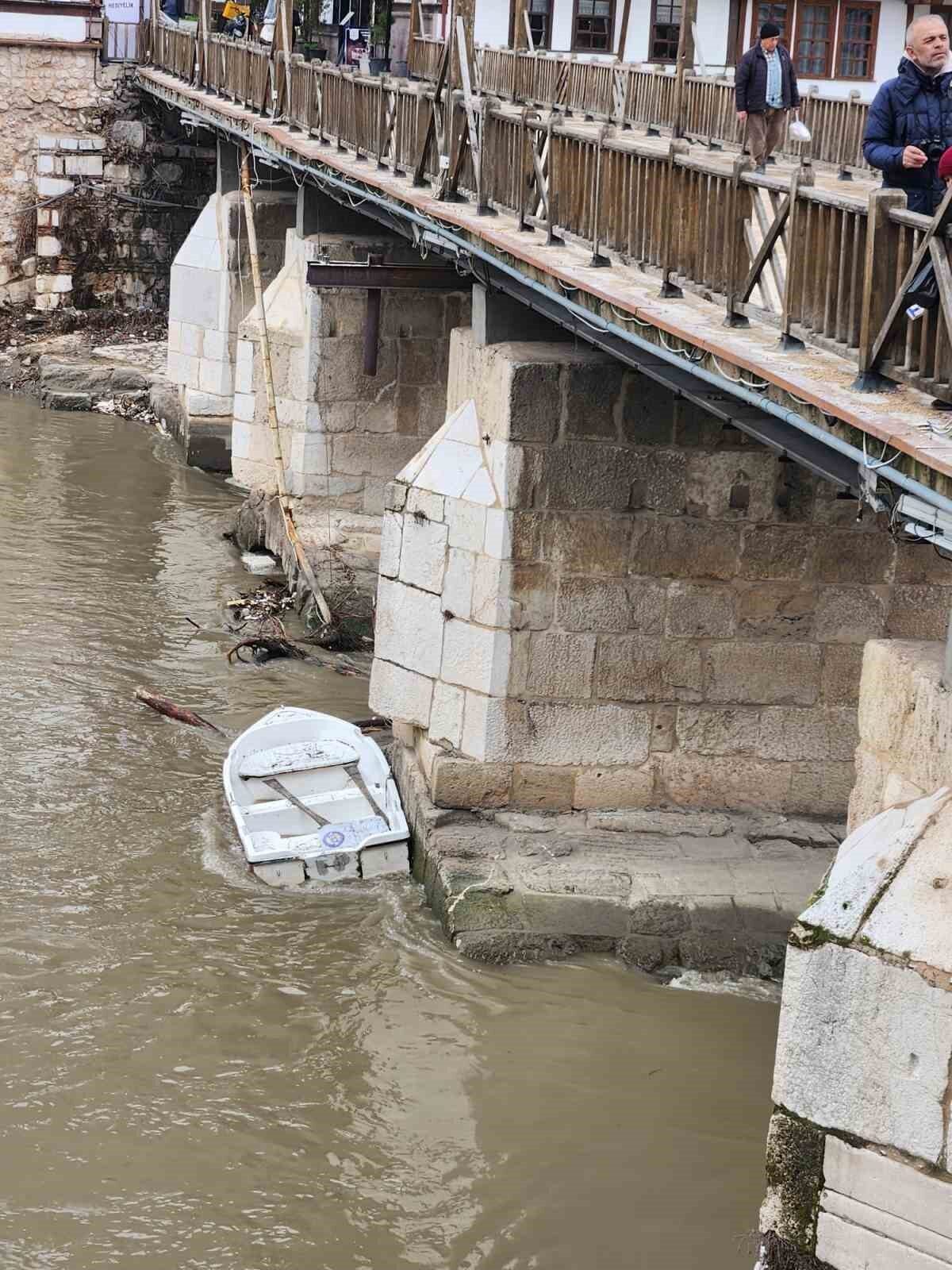 Amasya’da debisi yükselen Yeşilırmak Nehri’nde köprü ayağına takılan kayık vinç yardımıyla çıkartıldı.