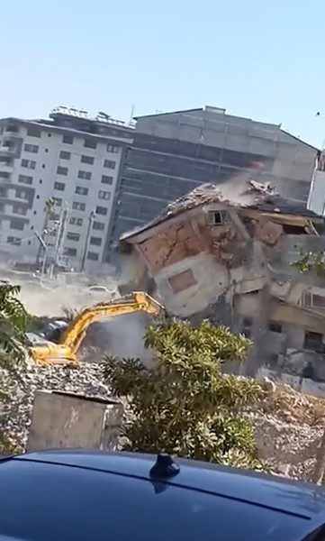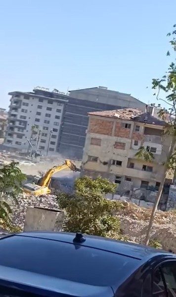Kahramanmaraş merkezli depremlerde büyük yıkımın yaşandığı Hatay’da mahkeme süreci tamamlanan binalar yıkılmaya devam ediyor. Depremin vurduğu Defne ilçesi Sümerler Mahallesi’nde mahkeme süreci tamamlanan 5 katlı bina, iş makinesinin darbesiyle kontrollü olarak yıkıldı. 5 katlı binanın kontrollü olarak yıkan operatörün binanın altında kalmaktan saniyelerle kurtulduğu anlar cep telefonu kamerasıyla saniye saniye görüntülendi. Görüntülerde; iş makinesinin boomun yıktığı binanın altından son anda kurtulduğu ve kontrollü yıkım anları kameraya yansıdı. 5 katlı binanın kontrollü yıkılma sırasında herhangi bir olumsuzluk yaşanmadı.
