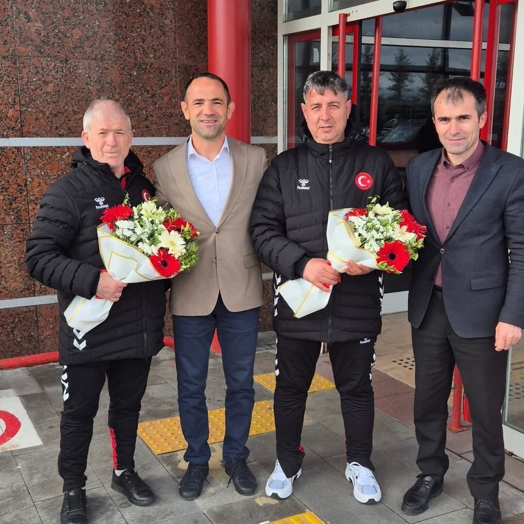 Gençlik ve Spor İl Müdürlüğü Şube müdürleri Yaşar Elen ile Ömer Karslı, Avrupa fatihlerine çiçek vererek tebrik ettiler.