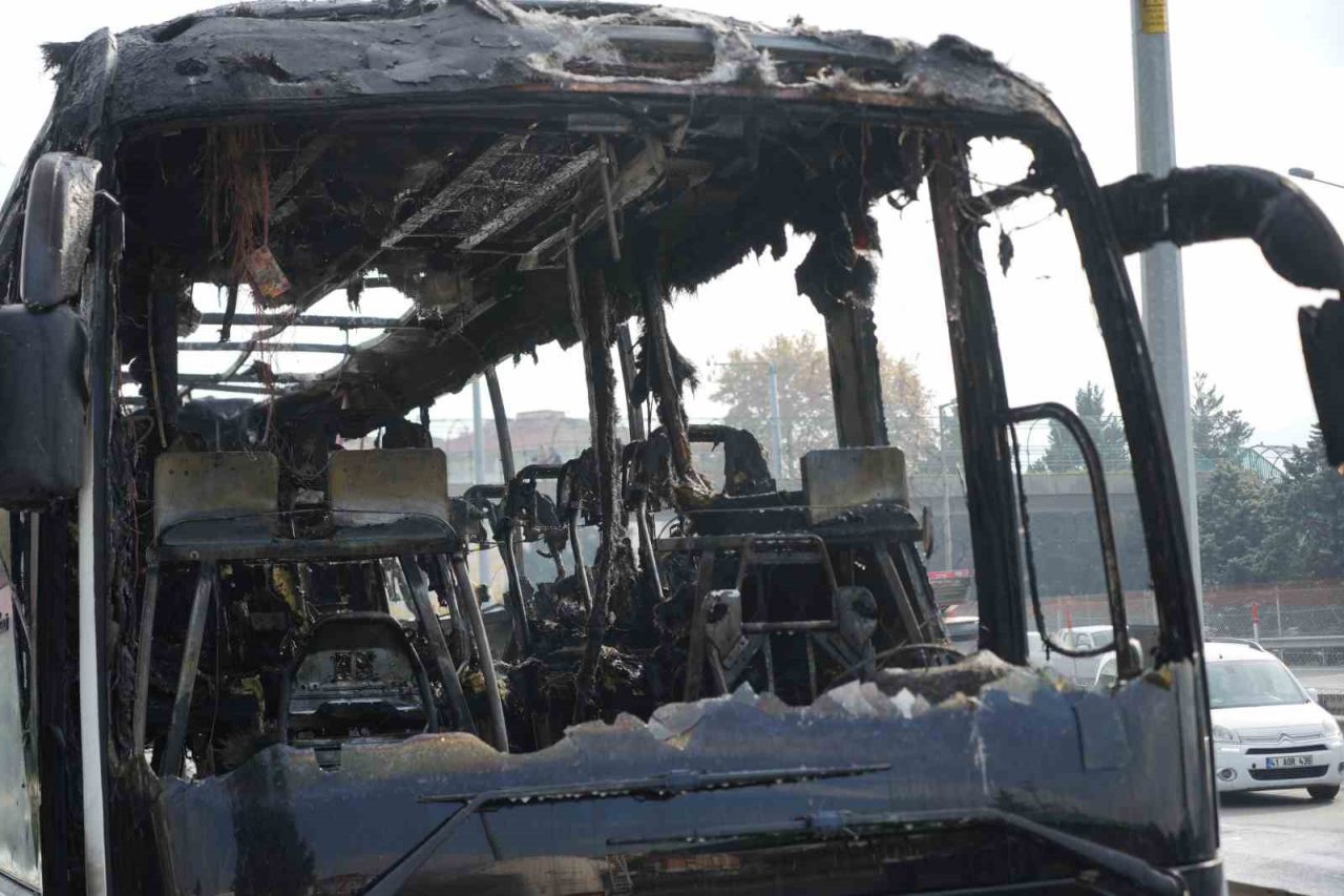 D-100 kara yolunun Kocaeli geçişinde alevlere teslim olan yolcu otobüsü demir yığınına döndü.