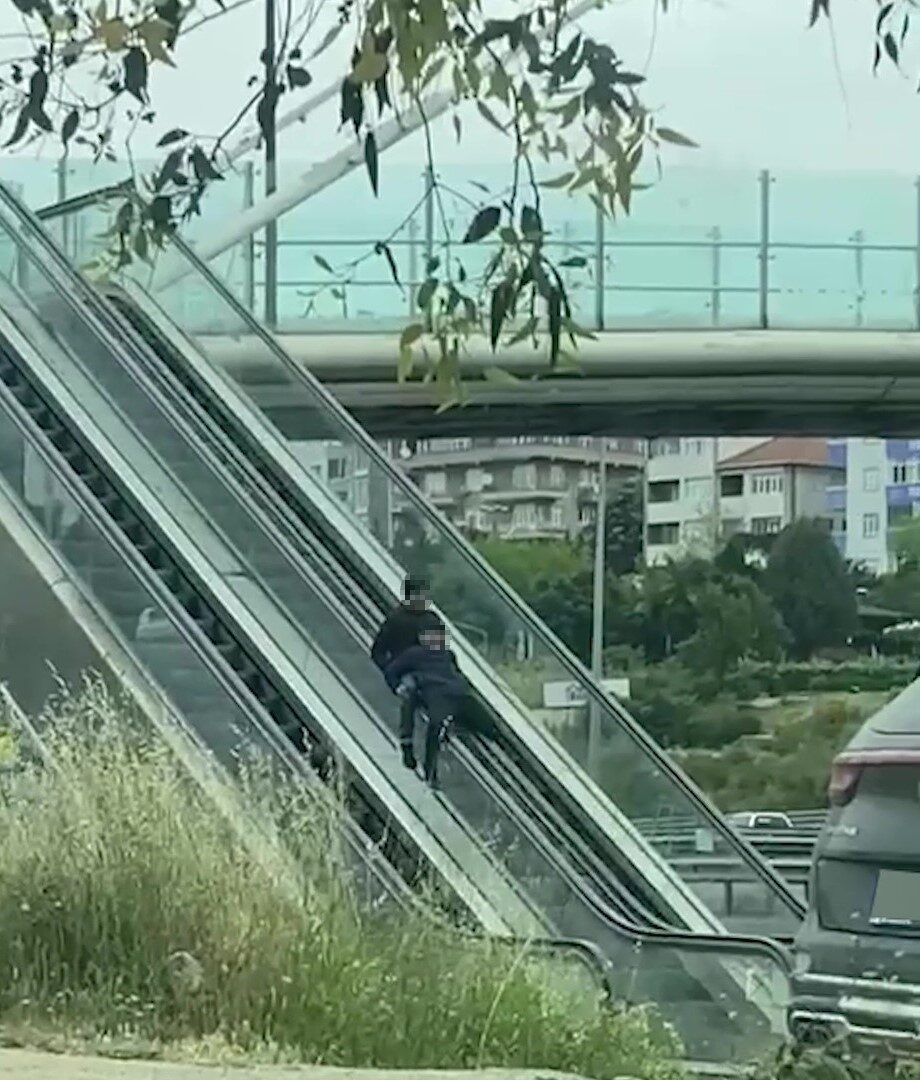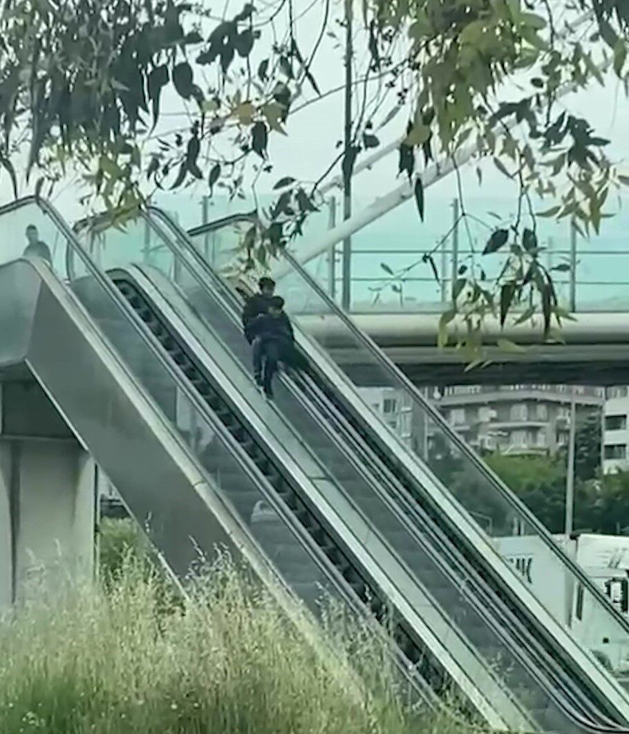 Kocaeli’de iki kişi, yürüyen merdiveni adeta lunapark aletine çevirdi. Yürüyen merdivenin bant kısmına binerek kayan çocukların tehlikeli oyunu, güvenlik kameraları tarafından kaydedildi.