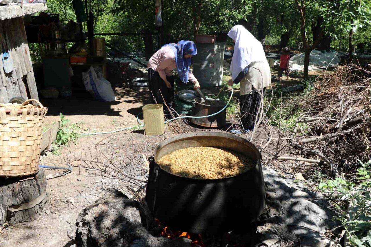 Uzun uğraşlar ile hiçbir katkı maddesi kullanılmadan hazırlanan pekmezin el becerisi gerektirdiğini anlatan Medine Turgut, “Uzun uğraş ve zahmetler sonucu el işçiliği ile tamamen doğal yollardan hiçbir katkı maddesi kullanılmadan üretilen pekmezlerimiz kış mevsiminde her derde deva olarak kullanılır. Dutlar kazanda kaynatılır, şırası elde edilir. Kaynatma işlemi uzun süre uygulanır. Kaynatma işlemi açık yayvan kaplarda yapılır ve düşük ısıda koyulaşıncaya kadar kaynatılır. Kaynatma kazanında şıra kaynamaya başlayınca oluşan köpükler kepçe ile alınır. Kaynama ilerledikçe şıranın üstü sarı köpük bağlar, şıra içten içe kızarır, göz göz olarak kaynar ve pekmez kokusunu yayar” diye konuştu.
